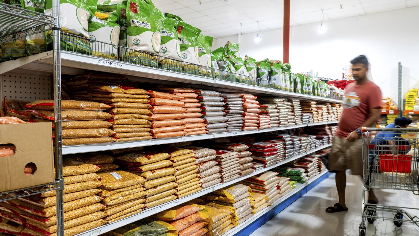 A customer shops a grain isle at New India Bazar, where most merchandise is imported from India and Canada, on Aug. 6, 2025, in Fremont, Calif.
